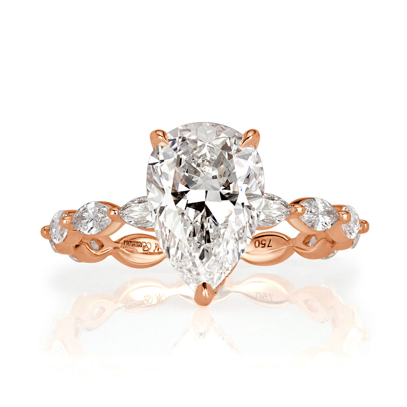This exquisite pear shaped diamond engagement ring features an incredible 2.26ct pear shaped center diamond GIA certified at H, SI1. It is white and perfectly eye clean, even being graded at SI1, with each one of our stones being hand selected by Mark Broumand himself. It is exceptionally showcased atop a unique 18k rose gold shank adorned with marquise cut diamonds. For added sparkle, the center basket is equally studded with a hidden halo of round brilliant cut diamonds. Be sure to enjoy the compliments to come with this one of a kind engagement ring!