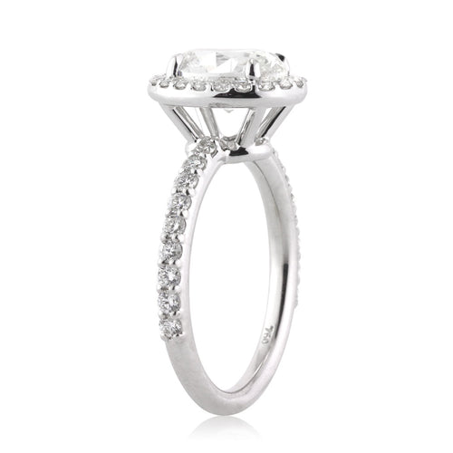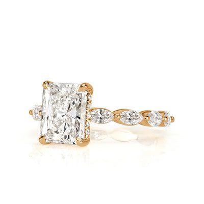 One of our bestselling wedding bands transformed into a stunning engagement ring! This design features a beautiful 2.21ct radiant cut center diamond that is GIA certified at J-VS1. This incredible diamond faces up a brilliant white and sparkles immensely. It measures at an amazing proportion of 8.55 x 6.71mm and is graded excellence in both polish and symmetry. The centerstone sits right above our signature marquise cut band in 18k champagne yellow gold and has a hidden halo detail for additional sparkle. Give your dream girl her dream ring with this dreamy radiant cut diamond engagement ring!