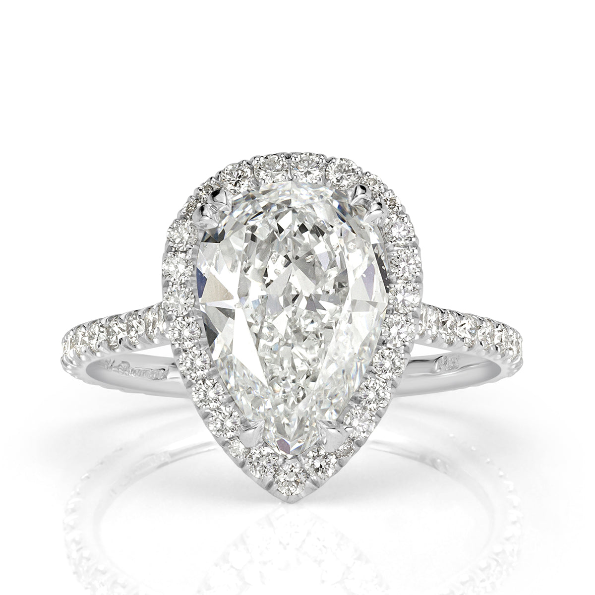 This breathtaking pear shaped diamond engagement ring showcases a beautiful 2.46ct center diamond GIA certified at E-SI2. This stunner faces up colorless and is perfectly eyeclean with it's minimal white inclusions.  The amount of brilliance this diamond gives off is truly awe-inspiring! It is adorned with a shimmering halo of round brilliant cut diamonds that allows incredible finger coverage when worn. Additionally, the basket connectors and tapered shank are studded with diamonds in a finely detailed pave setting. This piece is set in a luxurious platinum metal that blends in naturally with the white of the diamonds. She will cherish this pear shaped diamond engagement ring forever!
