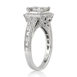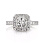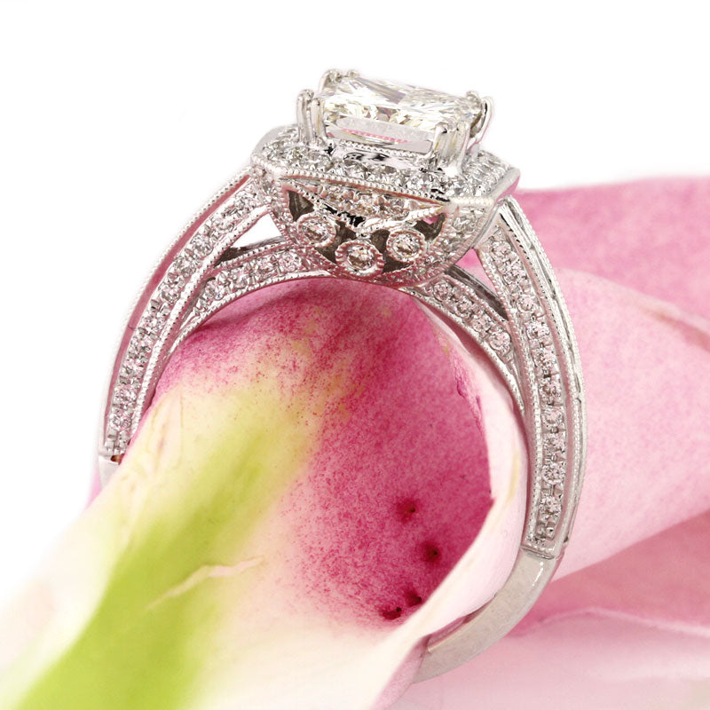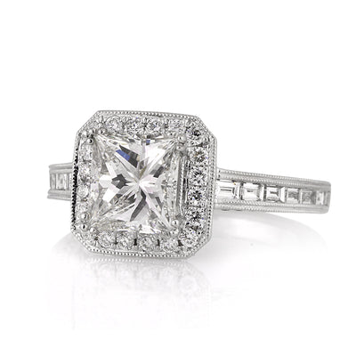 This mesmerizing work of art is so incredibly beautiful! The astonishing 1.78ct princess cut diamond set in the center is GIA certified, one of the leaders in diamond grading, at H-VS2. It is white and very clear! The outstanding cut actually makes it look at or above two carats in the center! The brilliance is sensational as well. The unique diamond setting features a halo of round diamonds in a pave setting. The shank is channel set with baguette cut diamonds and round diamonds pave set on either side. The magnificent center basket has such a gorgeous design and is studded with round diamonds as well. Milgrain detail completes the beautiful piece made in high polish 18K white gold. This exceptional ring is sure to be cherished for generations to come. Amazing from every angle.