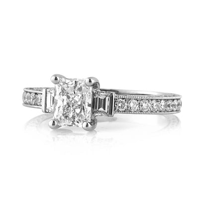 This mesmerizing radiant cut diamond engagement ring and wedding band set is absolutely breathtaking! The gorgeous 1.20ct radiant cut center diamond is GIA certified at F-VVS1. It is exceptionally white and practically flawless! It is flanked by two gorgeous baguette cut diamonds followed by round brilliant cut diamonds in a pave setting on all three sides of the shank. This custom made platinum engagement ring is handcrafted to perfection along with the gorgeous platinum wedding band, which is handmade to fit perfectly flush with the engagement ring. The total side diamonds come to 1.35ct on the engagement ring and 0.60ct on the wedding band. It features a row of round diamonds in a pave setting with milgrain detail throughout. This magnificent diamond wedding set is astonishing in so many ways! Get ready for the compliments.