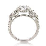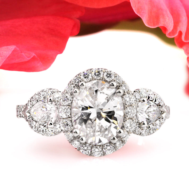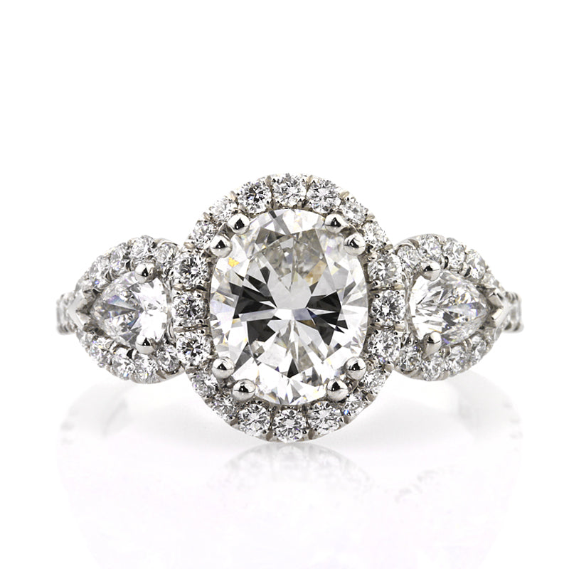 This magnificently beautiful oval cut diamond engagement ring will take your breath away! The outstanding combination this magnificent diamond has and the incredible design is just so amazing. The 1.72ct oval cut center diamond is GIA certified (one of the leaders in diamond grading) at G-VVS2, white and practically flawless! The cut and shape is exceptional as well. It is very difficult to find diamonds in this weight range, especially with such an excellent color and clarity combination! It is flanked by two large pear shaped diamonds with a halo of round diamonds set around each of them. There is a row of round diamonds set down the shank as well. The diamonds are all set in a micro pave style setting which showcases the diamonds perfectly with very little metal showing. This design will also allow for a wedding band to sit perfectly flush with the engagement ring. Amazing from top to bottom. You are going to love it forever!