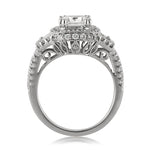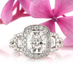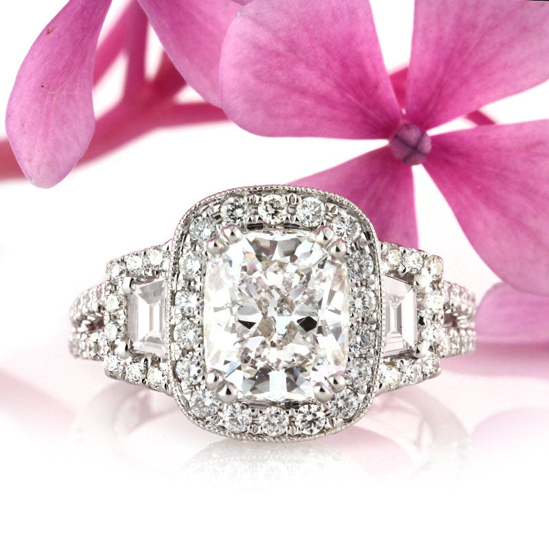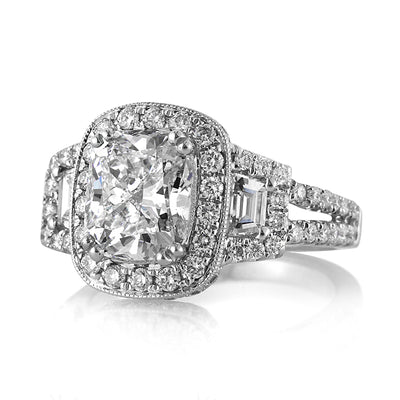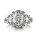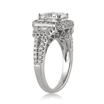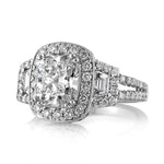 This astonishing cushion cut diamond engagement ring will mesmerize you with its fine details and magnificent quality! The 2.06ct cushion cut center diamond is GIA certified at D-VS2. It is exceptionally white, perfectly clear and has an excellent cut! This amazing diamond is showcased beautifully in this high polish 18k white gold setting featuring a halo of round diamonds in a pave setting flanked by two gorgeous step cut trapezoids and accented by round brilliant cut diamonds. The double shank is set with round diamonds as well. The unique center basket is elegantly designed with handmade filigree accents with a round diamond pave set in the center and milgrain detail throughout. This spectacular piece is sure to be cherished forever!