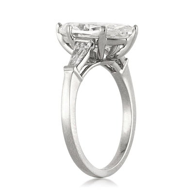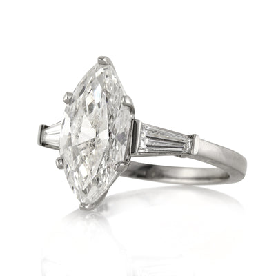 This absolutely gorgeous marquise cut diamond ring will astonish you with its outstanding size and quality combination and the cut is just breathtaking! The 3.03ct marquise cut center diamond is EGL certified at E-F SI2. It is exceptionally white and the inclusions are all white, blending in giving you an eye clean look. This magnificent diamond sparkles tremendously and is accented by two beautiful tapered baguettes flanked on its sides. They are all set on high polish platinum in a simple and elegant design. You won't be able to stop looking at it!