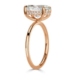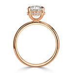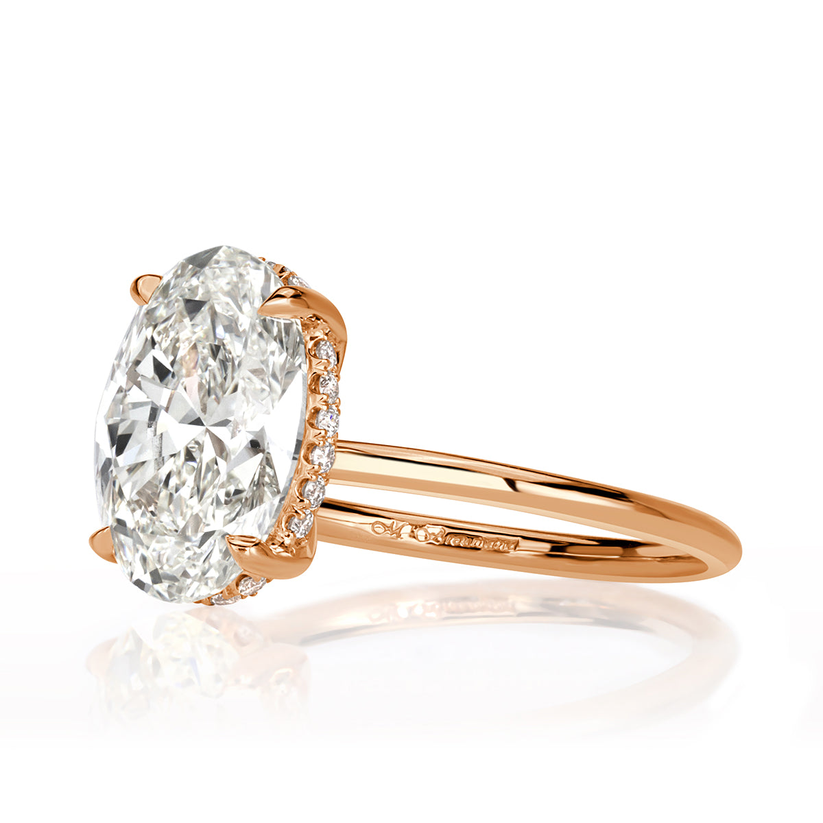 Go for classic beauty with this stunning diamond solitaire engagement ring. This design showcases an remarkable 3.21ct oval cut center diamond that is GIA certified at J-VS1, facing up very clean with tremendous sparkle. This one-of-a-kind stone measures at 11.98 x 8.14mm and is of an amazing value! The centerpiece is perched ontop of our signature hidden halo detail which consists of shimmering round brilliant cut diamonds. This design is styled in our soft and feminine 18k rose gold setting. This oval cut diamond engagement ring is absolutely gorgeous and truly lets the diamond speak for itself!