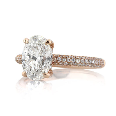 This truly mesmerizing oval cut diamond engagement ring in rose gold will captivate you with its style, beauty and brilliance! The gorgeous 2.51ct oval cut center diamond is GIA graded at H-SI2. It is white, eye clean and extremely brilliant! It is accented by three rows of round diamonds in a micro pave setting, which lead up the shank to the center prongs that are studded with round diamonds as well. This gorgeous 18k rose gold engagement ring is absolutely astonishing from every angle. You will love staring at it!