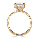 Exceptional quality, elegant design and classic beauty are all apparent in this 18k champagne yellow gold round brilliant cut diamond engagement ring. The incredible 3.01ct round brilliant cut center diamond is GIA certified at I-VS2. The centerstone faces up remarkably white and is perfectly eye-clean. It is graded at excellent for cut, polish and symmetry. It is handcrafted in a four-prong design and adorned by shimmering round brilliant cut diamonds set in a micropavé setting on the shank as well as on the hidden halo. Be amazed with this spectacular round brilliant cut diamond engagement ring!