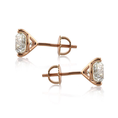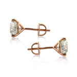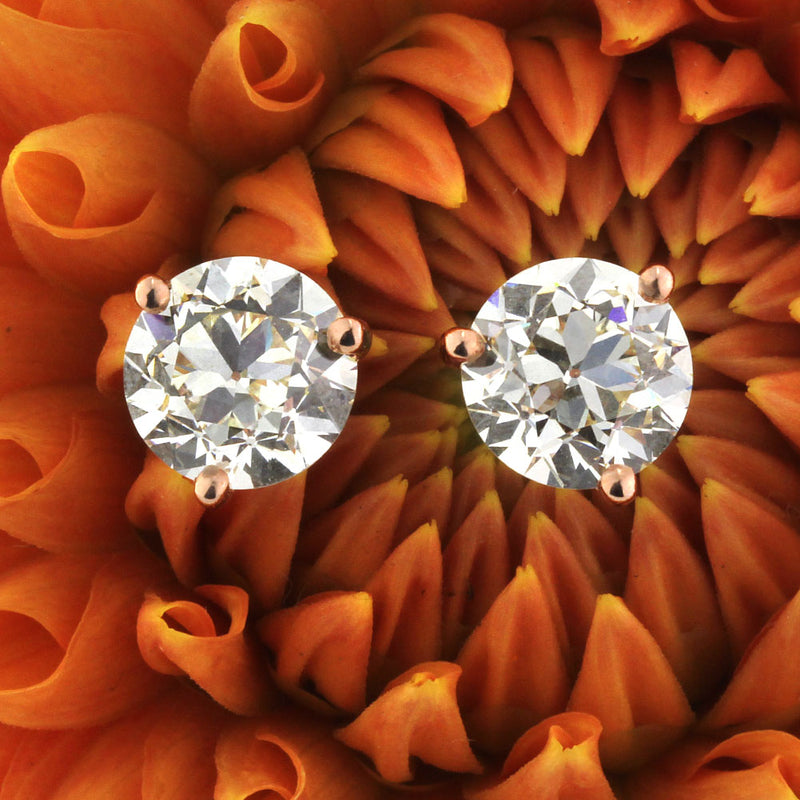 This mesmerizing pair of antique European round cut diamonds is so unique and beautiful! Both diamonds (individually 1.71ct, 1.70ct) are GIA certified at Q-R, VS2 and match perfectly in cut. They are set atop rose gold martini style backings, which showcase them phenomenally! These magnificent antique diamonds feature larger facets that reflect extraordinary brilliance.