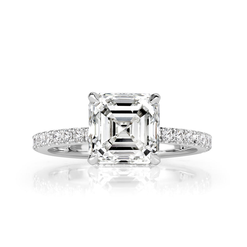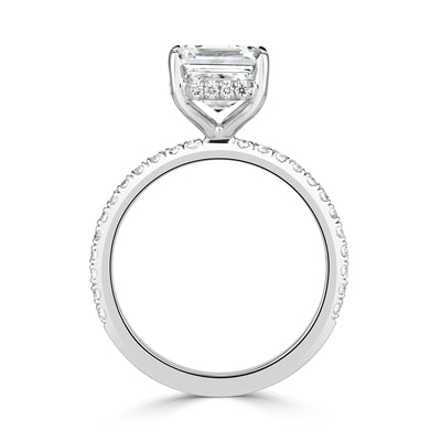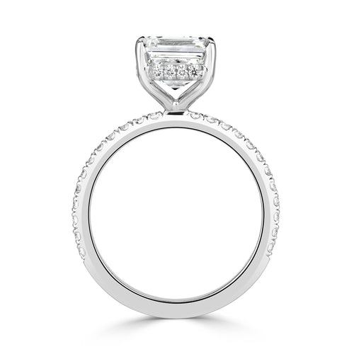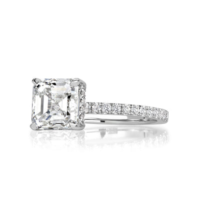 Asscher cut diamonds are uniquely beautiful and this one is of no exception. The stunning 3.01ct asscher cut poised in the center of this engagement ring is GIA certified at I-VS1, facing up a beautiful white color and clear. This beauty has a phenomenal cut with crisp, clean facet lines. It measures 7.77 x 7.76mm and is graded excellent for both polish and symmetry. It is set on an exquisite platinum setting accented with sparkling round brilliant cut diamonds pavé set on either side going down past halfway, as well as an additional row of shimmer with our signature diamond hidden halo design. This sleek design allows the astonishing asscher cut to appear as if it floating on the finger!