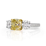 This dreamy three-stone ring is set in a unique two-tone design with an 18k yellow gold basket and platinum band. This beauty features an incredible 2.06ct old mine cut center diamond certified at Fancy Yellow-VVS2. It faces up a vibrant yellow, is super clean and sparkles with intense scintillation! It measures at an amazing proportion of 7.07 x 7.05mm and the cut is excellent. The centerpiece is complemented with round brilliant cut diamonds on either side and has additional diamonds going down the shank in a beautiful channel set design. This gorgeous piece is made by Tiffany & Co. and comes with all original paperwork and the Tiffany & Co. ring box. Get ready for all the compliments with this stunning old mine cut diamond engagement ring!