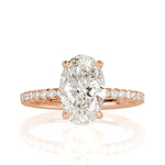 Exceptional quality and classic beauty are all showcased in this gorgeous oval cut diamond engagement ring. The beautifully elongated 3.00ct oval cut center diamond is GIA certified at J-SI1. The centerstone faces up remarkably white and is perfectly eye-clean, appearing more like a VS+ diamond under 10x magnification. This stunner measures at an amazing proportion of 12.29 x 7.73 mm and is graded excellence for both polish and symmetry. It is handcrafted in a four-prong design and adorned by round brilliant cut diamonds set in a micro pavé setting on the shank as well as on the hidden halo. Handcrafted in a luxurious 18k rose gold setting, this beautiful oval cut diamond engagement ring is sure to win over her heart!