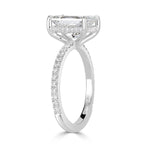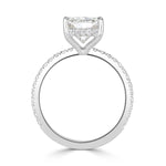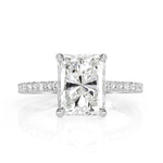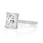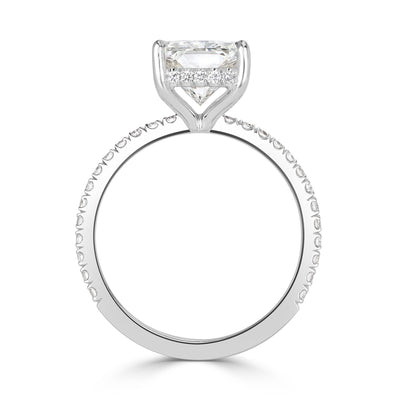 This incredible radiant cut diamond engagement ring is the ultimate statement of elegance. The gorgeous 3.02ct radiant cut center diamond is GIA certified at I-VS2. It is perfectly eye clean and extremely brilliant. Its excellent grading in both polish and symmetry add to this diamond’s fiery display. It measures at an incredible proportion of 9.41x7.46 mm and shows off a stunning elongated shape. The centerpiece is complimented by our signature hidden halo design peeking out from below. For additional sparkle, the platinum shank is also accented with round brilliant cut diamonds pavé set down the shank. She will not be able to stop talking about this perfect and finely detailed radiant cut diamond ring!