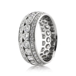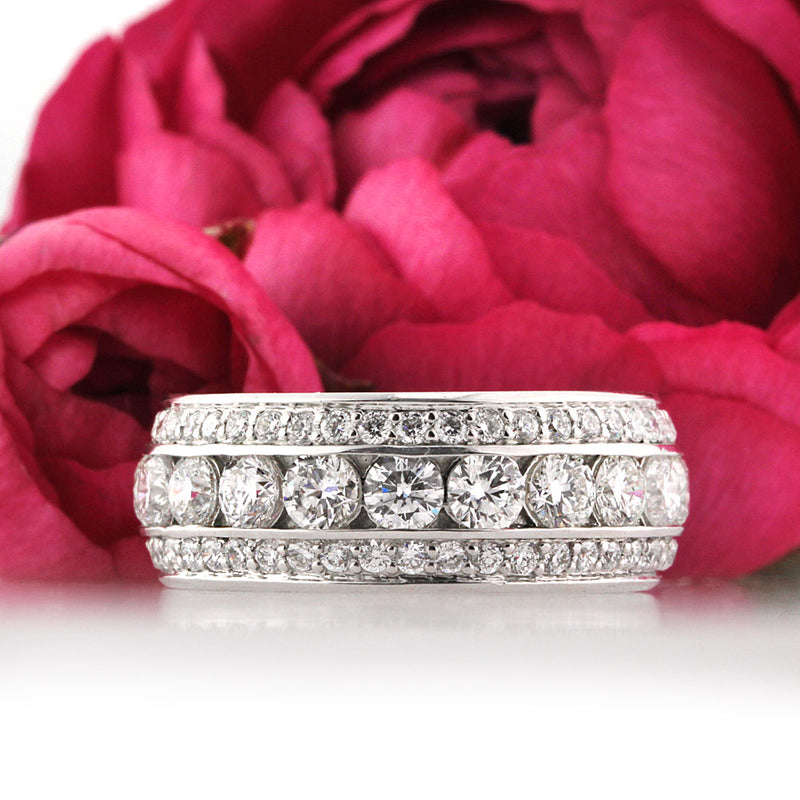 Be simply amazed with this three-row round brilliant cut diamond eternity band. The bright round brilliant cut diamonds are matched to perfection and are set in a channel setting at the center of the band. The row of larger center diamonds is flanked by two rows of round pavé diamonds. Clean lines and a wide look makes this eternity band quite a statement on the hand.