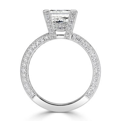 This mesmerizing princess cut diamond engagement ring is sparkle overload! This design showcases a stunning 2.41ct princess cut center diamond that is GIA certified at G-SI2. This beauty faces up a crisp white and is perfectly eye-clean. It looks more like a VS2 certified diamond even under 10x magnification, an amazing value! It is also graded in excellence for polish and symmetry. The centerpiece is set on a high profile styling with shimmering round brilliant cut diamonds set on the basket and it's connectors as well. The shank of this ring displays a substantial 3-row design with diamonds on all sides complimented with beautiful milgrain detailing on the edges. Handcrafted in a luxurious platinum setting, this princess cut diamond engagement ring is jawdropping and sure to dazzle from miles away!