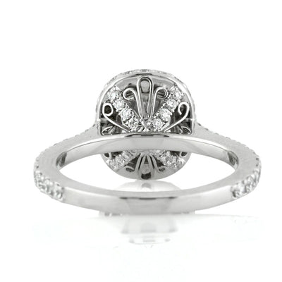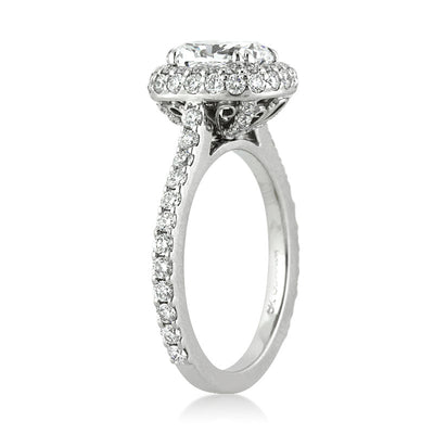 This exquisite cushion cut diamond wedding set is crafted to perfection. The colorless 1.80ct cushion cut diamond is GIA certified at D, VS1. The almost two carat center stone is extremely white and brilliant and sits atop a domed, two row diamond pave halo. Glistening round brilliant cut diamonds are pave set on the shank and the connectors for extra sparkle. For added detail, fine filigree is added in the basket area. This spectacular cushion cut engagement ring has a perfectly matching wedding band. This incredible platinum and diamond wedding set will become a family heirloom.