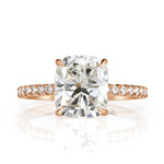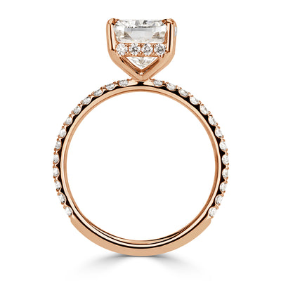 Elegant brilliance is what this diamond engagement ring is all about. This piece features a remarkable 3.03ct cushion cut center diamond that is GIA certified at I-SI1. The pure whiteness of the diamond truly pops against our feminine 18k rose gold setting and looks more like a G-H color diamond. The small, white inclusions blend in naturally and allows the diamond to face up like a VS1 gem. It also displays incredible measurements of 9.15 x 7.86 mm and is huge for it's weight! The centerpiece is designed to be sat up high in a basket adorned with shimmering round brilliant cut diamonds in our signature hidden halo detail. More diamonds are accented going down either side of the shank for tremendous brilliance. The beautiful pillow shape of this cushion cut diamond gives off a soft allure, yet makes a grand statement when worn on the finger.