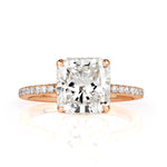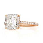 Exceptional quality, elegant design and classic beauty are all showcased in this rose gold radiant cut diamond engagement ring. The dazzling 3.08ct radiant cut center diamond is GIA certified at J-SI1, beautifully white and perfectly eye-clean. This SI1 faces up more like a VS1 diamond with its small, white feather inclusions, an incredible value! The phenomenal cut on this three carat center stone affords the diamond an extremely brilliant sparkle. It is set in with four prongs and accentuated by round brilliant cut diamonds set in a hidden halo and micro pavé designed setting on the shank. Be blown away with this timeless rose gold radiant cut diamond ring!