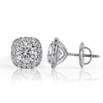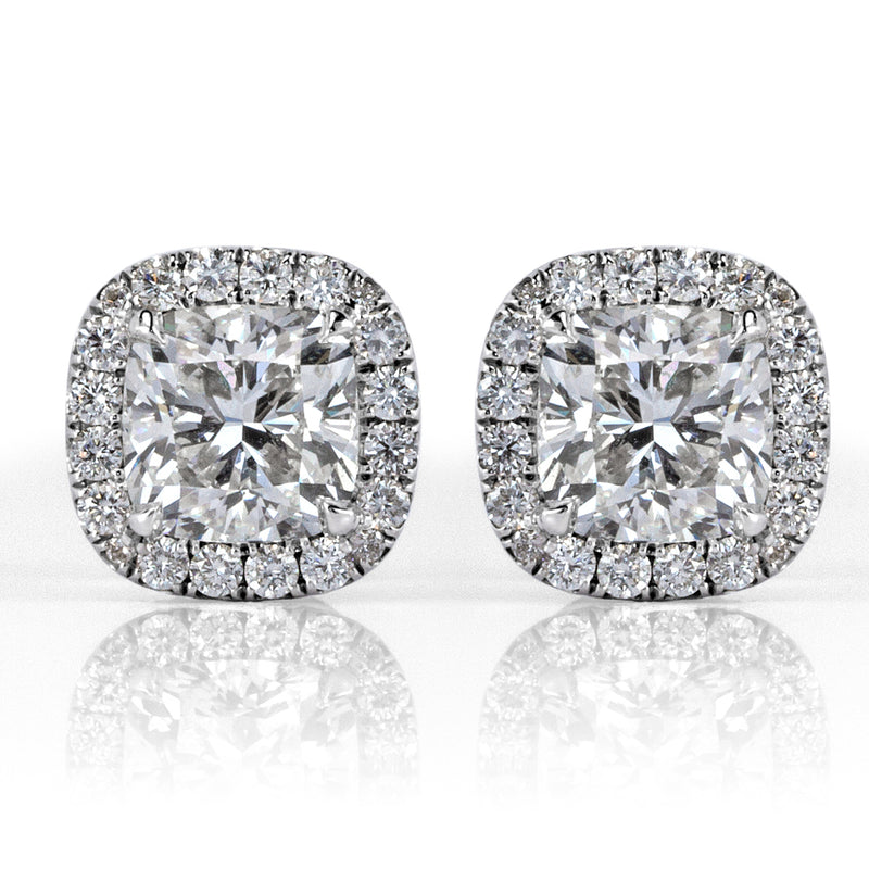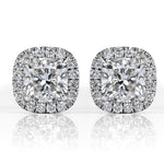This gorgeous pair of custom-made cushion cut diamond stud earrings gives you unparalleled beauty and brilliance at a great value. Featuring two cushion cut GIA certified center diamonds totaling 3.10ct with G-H color. Creating a mesmerizing sparkle, beautiful rows of round brilliant cut diamonds are pave set in halos around each cushion cut diamond. Expertly designed in 18k white gold they feature screw backs for added security. These hypnotic beauties are perfect for any occasion.