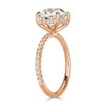 This old mine cut diamond engagement ring is feminine and classy. The centerpiece features a gorgeous 3.08ct old mine cut diamond that is GIA certified at I-VS2. It faces up a sparkling white and is perfectly eyeclean! This stunner measures at an amazing proportion of 8.65 x 8.32 mm and displays beautiful finger coverage. Perched on top of our signature hidden halo design, this diamond's shimmering white color truly pops against the soft 18k rose gold setting. Additional diamonds are set going down the shank of the ring for extra shimmer. This old mine cut diamond engagement ring is an absolute dream come true and an incredible value!