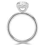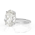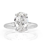 Handcrafted with the finest detail, this platinum oval cut diamond engagement ring is classic and timeless. The simepl solitaire design of this high polished design allows the center diamond to appear floating on the finger The centerpiece showcases a gorgeous 3.50ct oval cut diamond GIA certified at G-VS1. This beauty faces up a dazzling white and is extremely clear. It displays a stunning voluptuous shape with proportions of 11.76 x 8.83mm and is also graded at excellent for both polish and symmetry. For extra sparkle, shimmering round brilliant cut diamonds are set on our signature hidden halo detail. This amazing oval cut diamond engagement ring is everything she been dreaming of!