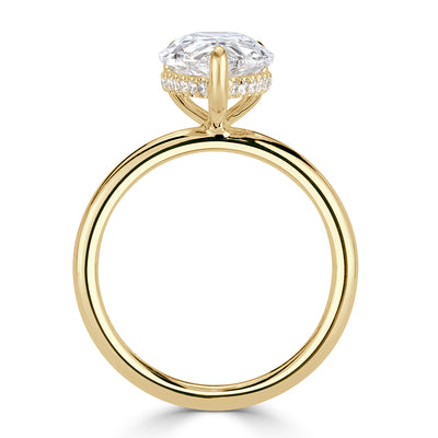 This stunning pear shaped diamond solitaire engagement ring is such an outstanding value! The juicy 3.51ct pear shaped center diamond is GIA certified at J-VS1. It is exceptionally white, has a crisp cut and faces up like a 4ct+ diamond due to it's amazing proportion of 13.77 x 8.21mm. It is handcrafted in a summery 18k yellow gold champagne metal. For additional sparkle, there are accents of round brilliant cut diamonds on the hidden halo design. This luxurious pear shaped diamond engagement ring is mesmerizing from every angle!