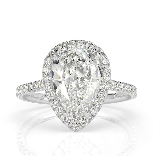 This stunning pear shaped diamond engagement ring will sparkle from miles away! This design showcases a gorgeous 3.00ct pear shaped diamond GIA certified at D-SI1. This beauty faces up absolutely colorless and faces up more like a VS2 diamond, an incredible valued combination! The beautifully elongated shape of the pear is adorned by a shimmering halo of round brilliant cut diamonds. Diamonds are also handset on the basket connectors for extra sparkle. As a final touch, the dainty shank of the ring tapers upwards towards the basket center with micropavé set diamond accents. This beautiful pear shaped diamond engagement ring is sure to be a winner!