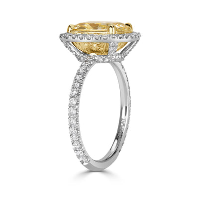 Beautiful and enchanting all around, this cushion cut diamond engagement ring is a positively bold look. GIA certified at Z-VS2, the 3.05ct center diamond displays a rich color that sparkles tremendously. This gem is of excellent proportions, measuring 9.21x7.23 mm. The beauty is perfectly eye-clean and is graded as excellent in both polish and symmetry, giving this diamond a truly gorgeous brilliance. The ring is designed with only perfection in mind and the warm yellow of the center truly pops against the shimmering halo of bright, white round brilliant cut diamonds. For additional sparkle, diamonds are also placed on the connectors and going down the shank of the ring. A one-of-a-kind handcrafted filigree detailing is shown in the 18k yellow gold underbasket bringing true romance to this exceptional piece. Achieve tremendous sparkle factor with this extraordinary diamond engagement ring.