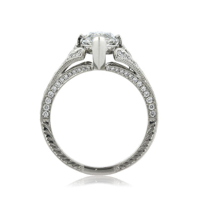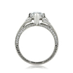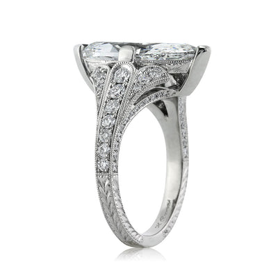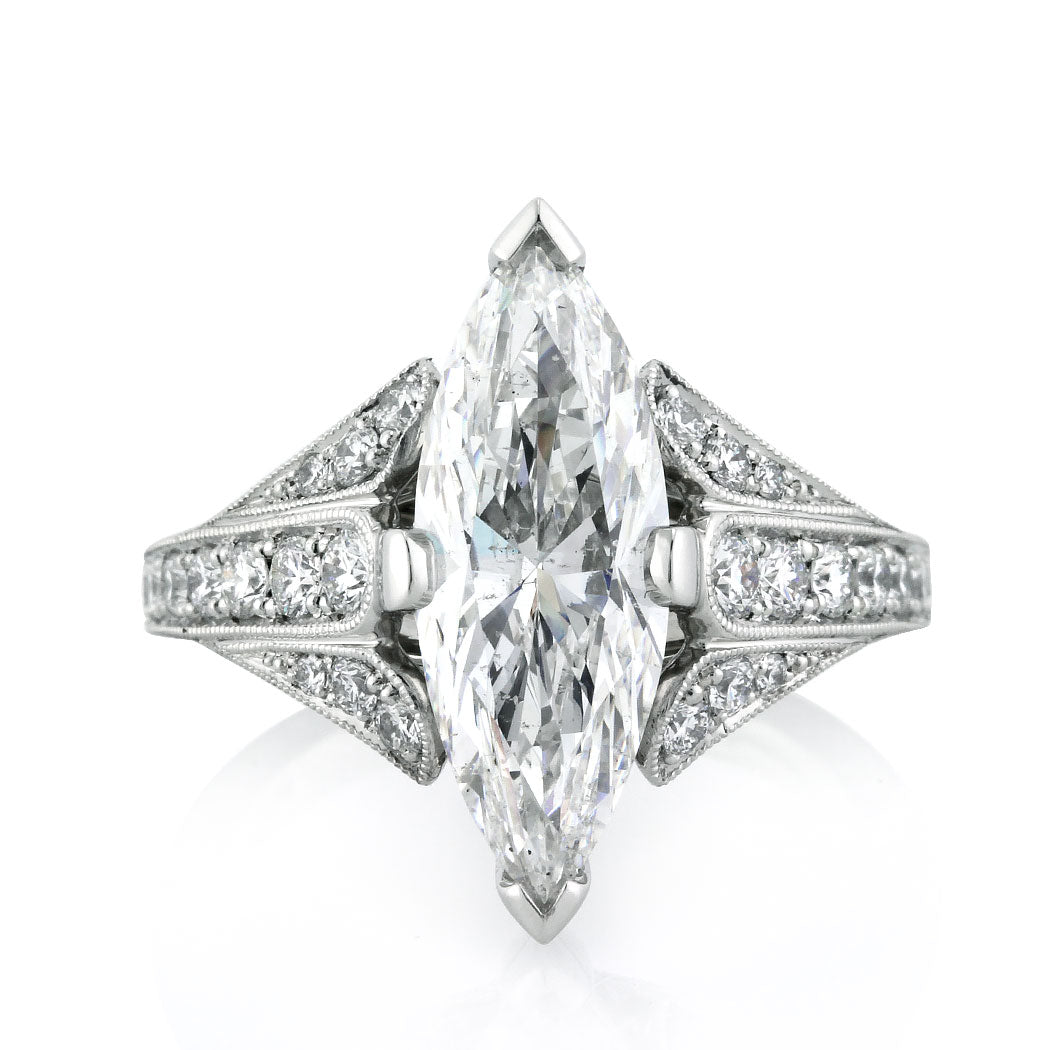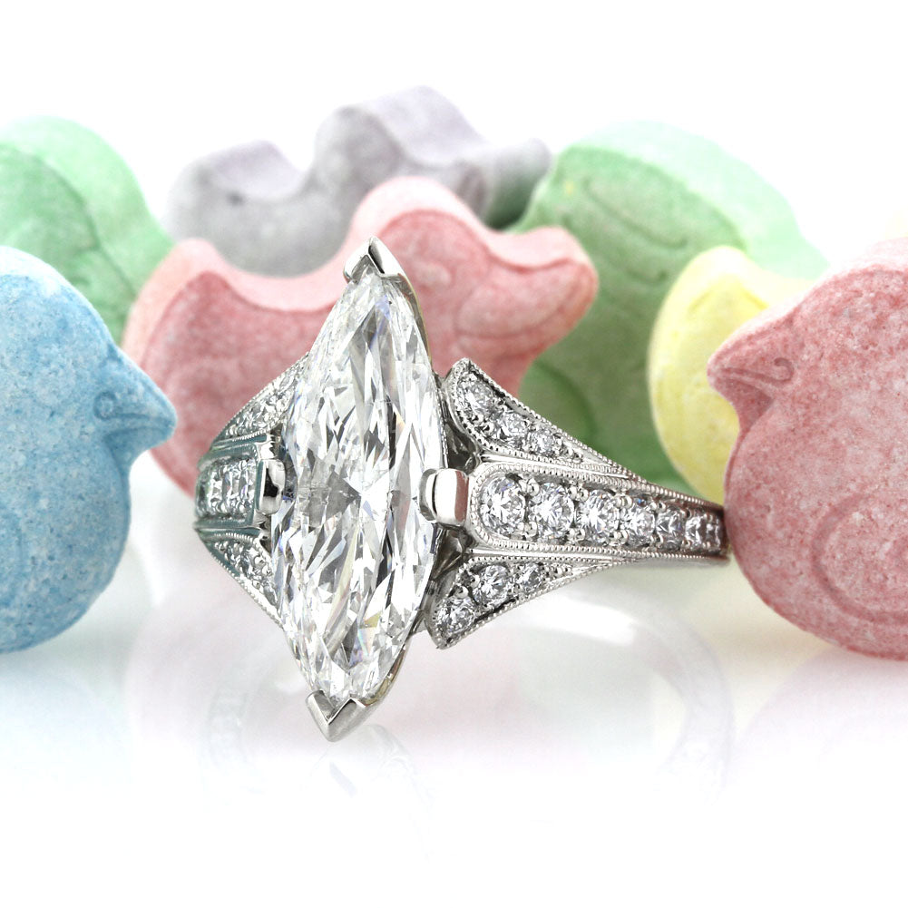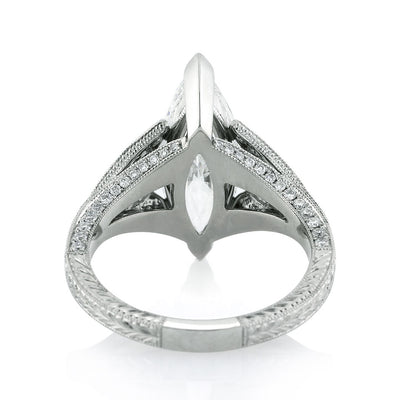 This astonishing marquise cut diamond ring is breathtaking! Immaculate detail, amazing design and outstanding hand craftsmanship come together perfectly in this custom crafted masterpiece. The super sparkly 3.01ct marquise cut center diamond is GIA certified at E-SI2. White, eye clean and beautifully cut. It is accented by round diamonds on its sides in a pave setting, also featuring milgrain detail throughout. The front and back of the piece is pave set with round diamonds as well. Handmade engravings adorn the center basket as well as the bottom of the shank on this magnificent piece. A true work of art.