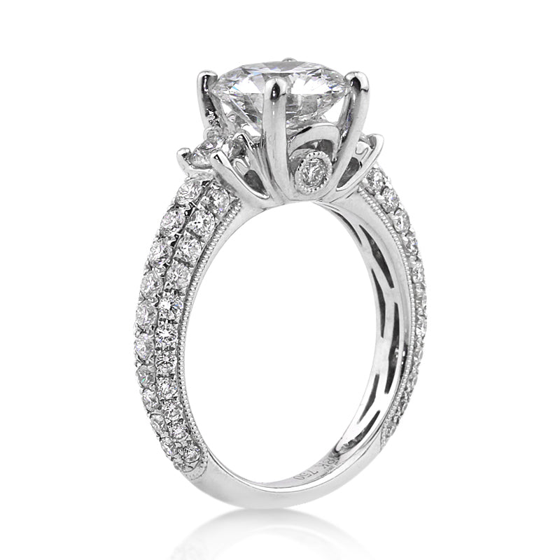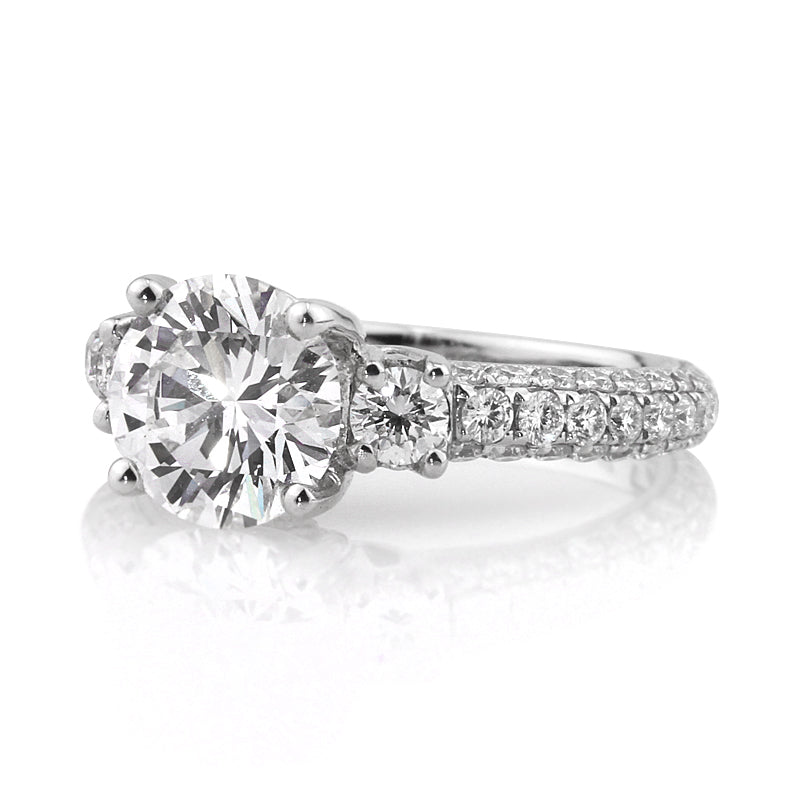 Undeniable brilliance, sensational craftsmanship, amazing design and spectacular quality go together hand in hand in this magnificent piece! The center features a super sparkly 2.03ct round brilliant cut diamond. It is certified by GIA at F-VS2, perfectly white and very clear! This is a special VS2 as it only has very small white feathers which are hardly visible under 10X magnification! It has an outstanding cut as well. It measures 8.44mm! This is a stunning diamond! It is accented by two large round diamonds flanked on its sides. The shank is set with three rows of round diamonds in a micro pave setting. The brilliance is breathtaking! You will love to show off this amazing piece. Words just can't describe how stunning it is. Get ready for the compliments!