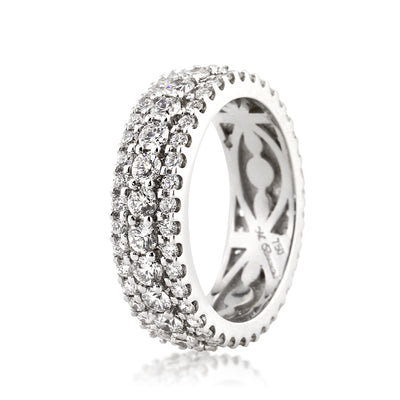 This magnificently beautiful three row round diamond eternity band pops with so much sparkle and beauty! This custom-made eternity band features a row of larger round diamonds set in the center of the band and a row of smaller round diamonds set on either sides of it. The combination is jaw dropping! The inside of the band is also custom made with a gorgeous design for added comfort. You will love the elegance and beauty of this magnificent eternity band!