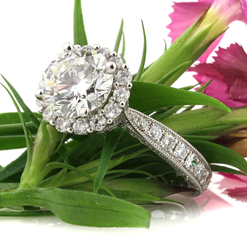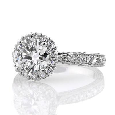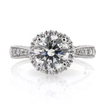 This breathtaking round brilliant cut diamond engagement ring will make you say wow every time you look at it! The incredible 2.06ct round diamond set in the center is GIA certified at I-SI2, white and eye clean! The cut grade is Excellent which means this amazing diamond shines like crazy! It is accented by a halo of round diamonds set around it. The sides feature round diamonds pave set on all three sides. The shank graduates smaller as it gets to the center creating a very elegant and sleek look. This spectacular round diamond engagement ring really has an amazing combination of quality, design and craftsmanship that is sure to please! A magnificent piece you will love forever!