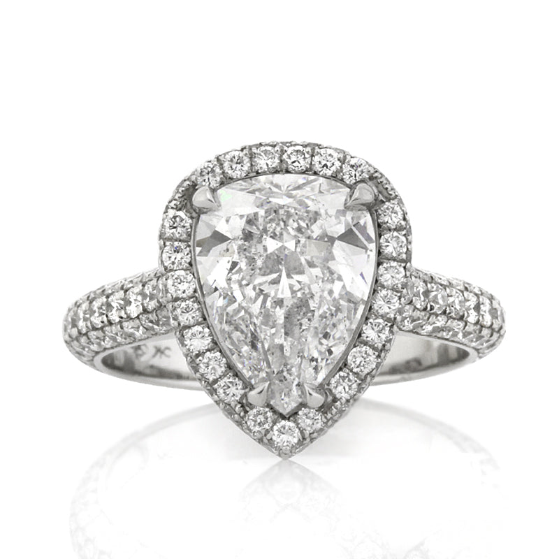 This remarkably beautiful pear shaped diamond engagement ring will astonish you with its quality, brilliance, design and outstanding craftsmanship! The stunning 2.40ct pear shaped diamond set in the center is AGS certified, one of the leaders in diamond grading, at D-SI2. It is the best, whitest color diamond you can get and eye clean! The cut is exceptionally beautiful! It has tremendous brilliance! The custom-made platinum setting features a halo of round diamonds set around it and a row set on the sides of the halo. The shank features three rows of round diamonds set in a micro pave setting. The diamond sit very closely to each other and create a magnificent brilliance that is captivating! This remarkably beautiful pear shaped engagement ring gives you tremendous value. A piece you will surely treasure forever!