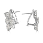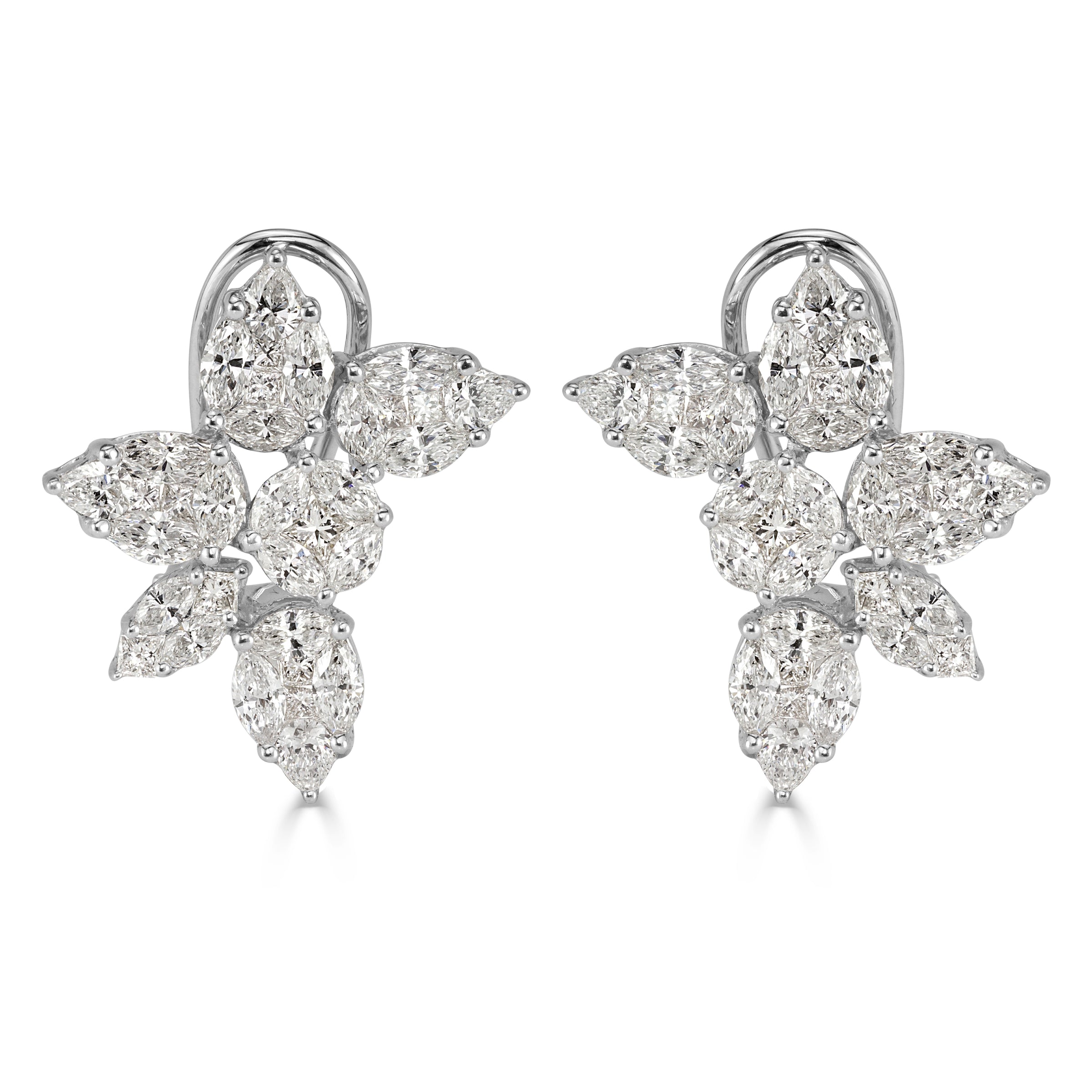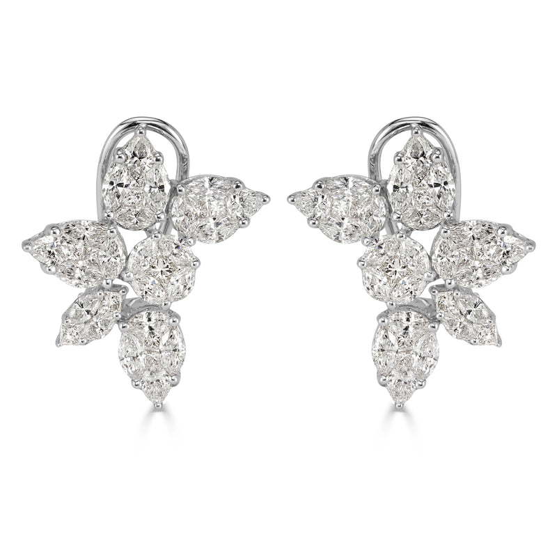 Elegantly chic is an understatement for these gorgeous diamond cluster earrings! 4.00ct of sparkling diamonds are handset in a beautiful 18k white gold floral setting. This cluster features an assortment of different diamond cut shapes for an eclectic luxurious feel including pear shapes, marquise and princess cuts. The diamonds are certified at premium qualities of G-H colors, VS1-VS2 clarities. They are feminine with just the right amount of glamour!