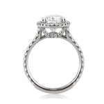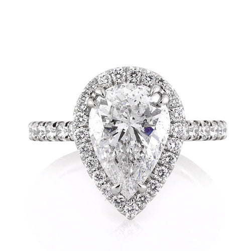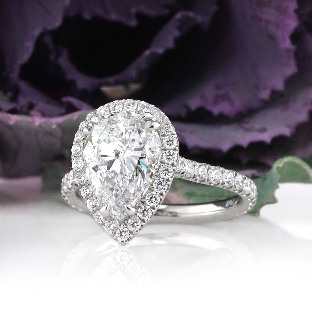 The shape, craftsmanship, and quality of this pear shaped diamond engagement ring is perfection. The beautiful 3.02ct pear shaped diamond in the center is GIA certified at E-I1. This three carat center stone is colorless and the inclusions are mostly white blending in with the stone giving the stone nearly an eye clean look. It is an amazing color and clarity combination giving the stone fantastic value. The center diamond is surrounded by round brilliant cut diamonds set in a micro pave style. For added beauty on this platinum setting, more round diamonds are set on the connectors and on the shank going three-quarters of the way down. This pretty pear shaped diamond engagement ring will leave her speechless!