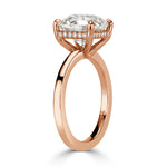 Sometimes the simplest things are the most stunning. This one-of-a-kind 3.95ct old mine cut diamond engagement ring is of no exception. The nearly four carat center diamond is GIA certified at J-VS1. It faces up like an H colored diamond and measures at amazing proportions of 9.90 x 9.19 mm. It's a cherry-picked and super rare diamond that showcases an impeccable cut and size. The center beauty is perched onto a classic solitiare design that is handcrafted in our soft 18k rose gold setting. A sweet subtle addition is our signature hidden halo design that peeks out from underneath the centerstone. She will bask in compliments for a lifetime with this beautiful old mine cut diamond ring on her finger.