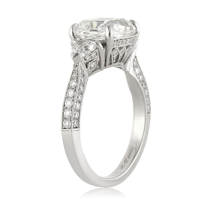 This mesmerizing cushion cut diamond ring is one of a kind! This astonishing piece is so exceptionally beautiful and detailed! The stunning three carat cushion cut diamond poised in the center is GIA certified at I-VS2. It is white, very clear and it sparkles tremendously! There are two beautiful trillion cut diamonds accenting it elegantly. The sides feature round brilliant cut diamonds, pave set on all three sides. The center and side basket design is outstanding! It is also studded with round diamonds. The brilliance this mesmerizing piece gives off is outstanding! You are going to be in awe when you see this gorgeous piece in person. Simply sensational!