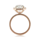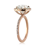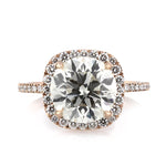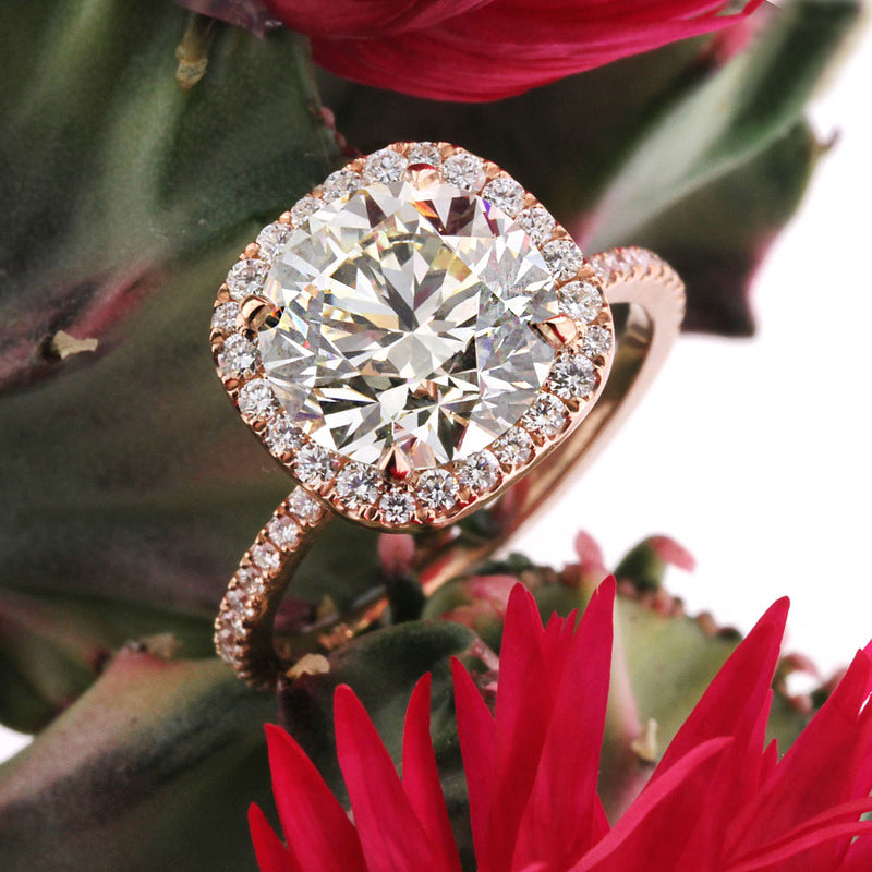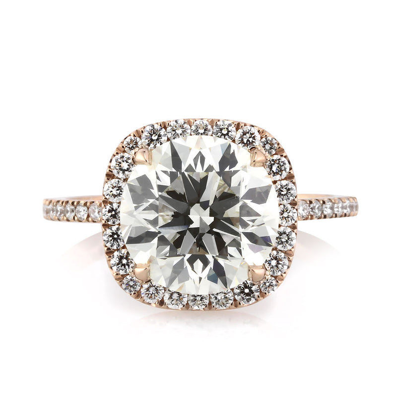 The combination of this round brilliant cut diamond engagement is quite special. The magnificent 3.53ct round brilliant cut center diamond is HRD certified at M-IF. It has an exquisite warm color and is flawless in clarity. The cut is outstanding and it radiates with tremendous brilliance. The  cushion shaped halo is set with micro pavé round brilliant cut diamonds and the shank is also adorned with diamonds. From the side view, round diamonds sparkle on the elegantly curved connectors. This dainty and very elegant 18k rose gold designer setting showcases the diamonds perfectly with minimal metal showing. The precise proportions, the well thought out design, and the beauty of the center stone brings this ring to life. Seduce your loved one with this dreamy diamond ring.