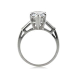 This well proportioned three-stone pear shaped diamond ring is quite impressive but has great value. The 3.86ct pear shaped diamond set in the center is GIA certified H-I1, near colorless with a few minute visible inclusions. The massive stone has laser drill work and looks much better than an I1. Its face up look is beautiful and bright. The baguettes on the sides are a great match and perfectly placed on the platinum setting. She'll feel lucky with this ring on her finger, and you'll feel lucky you grabbed the deal of the century!