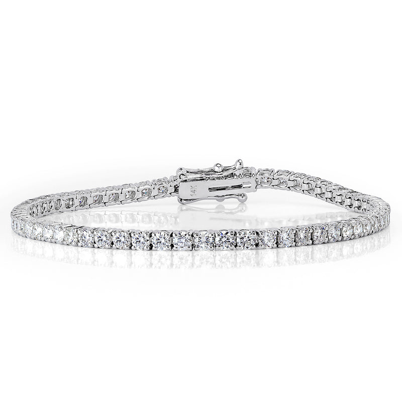 This diamond tennis bracelet is very elegant and sits beautifully on the wrist. This design features 4.21ct of shimmering round brilliant cut diamonds that are certified at F-G colors, VS2-SI1 clarities. It is set in 18k white gold in a classic 4-prong setting with double safety clasps for extra security.