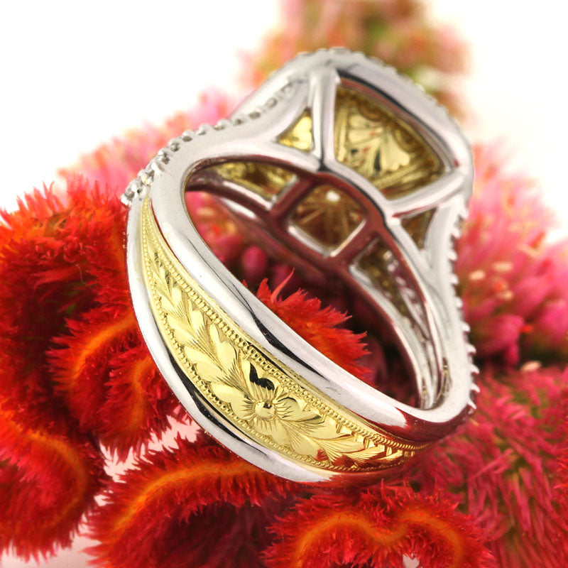 This gorgeous fancy yellow cushion cut diamond ring is breathtaking from every angle! The magnificent 3.28ct cushion cut diamond is GIA Certified at Fancy Light Yellow SI1. It has a rich and vibrant canary yellow color and it is spectacularly brilliant! A halo of round brilliant cut diamonds accents it and there are two rows of round diamonds set down the shank. The bottom of the shank and center basket are both hand engraved to perfection with tremendous detail and beauty. It is exquisite! An astonishing piece that you won't be able to take your eyes off of! Get ready for the compliments.