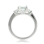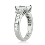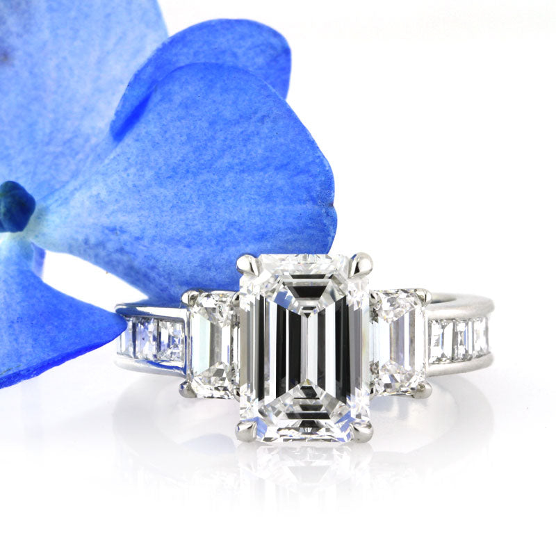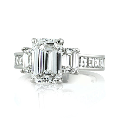 This magnificent emerald cut diamond engagement ring will knock you off your feet with its amazing beauty and extravagant quality! The exquisite 2.50ct emerald cut diamond poised in the center is GIA certified at E-VVS1, colorless and near flawless! The cut of this two and half carat emerald is absolutely brilliant and stunning. The two emerald cut side diamonds totaling 1.02ct are also GIA certified E-VVS1, a perfect match to the high quality center stone. The emerald diamonds are arranged in a three-stone fashion atop this custom platinum setting. Colorless step cut or carré cut diamonds are channel set down the shank providing extra sparkle to this one of a kind ring. This astonishing emerald cut diamond ring is of true heirloom quality and will be garnering compliments for generations!
