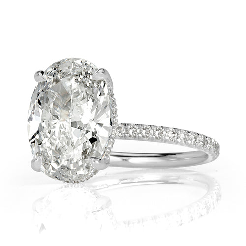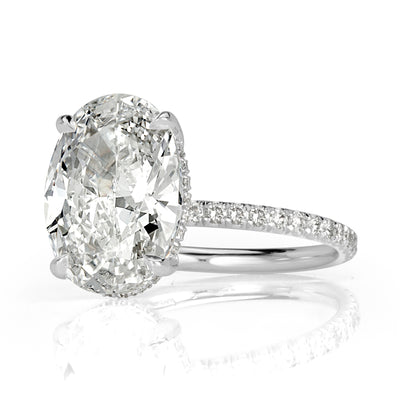 Everything about this extraordinary oval cut diamond engagement ring is impressive! The gorgeous 4.02ct oval cut center diamond is GIA certified at G-VS2. It is white, perfectly eyeclean and immensely brilliant! The luxurious platinum setting showcases it beautifully with the center diamond perched on a shimmering row of round brilliant cut diamonds set down the shank in a micropavé setting. This prominent diamond engagement ring is sure to capture her heart and be treasured for generations to come.