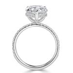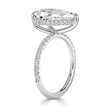 Present her a pear shaped diamond engagement ring like no other. This handcrafted 3-prong platinum setting showcases the gorgeous tear drop diamond amazingly. The 4.02ct diamond is GIA certified at H-VS2, facing up white and perfectly eyeclean. This stunner displays tremendous finger coverage with its proportions of 15.09 x 9.28mm. The centerpiece is perched on top of a delicate micropavé shank setting with diamonds set just past halfway. A beautiful surprise element, the hidden halo embedded into the ring's basket contains additional sparkling round brilliant cut side diamonds. This amazing pear shaped diamond is sure to shimmer from miles away!