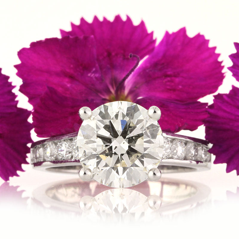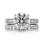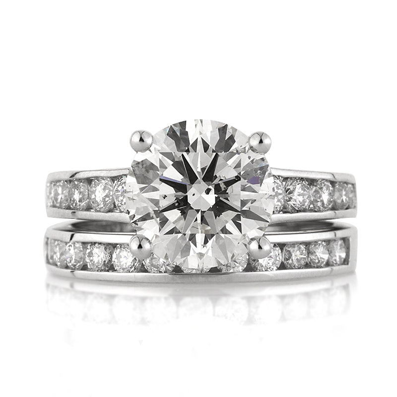 This remarkable round brilliant cut diamond engagement ring and wedding band set is absolutely astonishing! The gorgeous 3.22ct round brilliant cut center diamond is EGL certified at H-SI1. It is white, exceptionally brilliant and absolutely breathtaking! It is certified as an Ideal Cut diamond which means the proportions are perfect and it gives off tremendous brilliance. It is accented by a row of round diamonds set in a channel setting. The perfectly matching band accompanies this gorgeous engagement ring. It is mesmerizing! Get ready for the compliments.