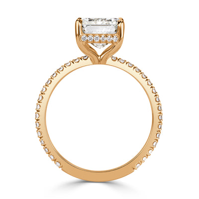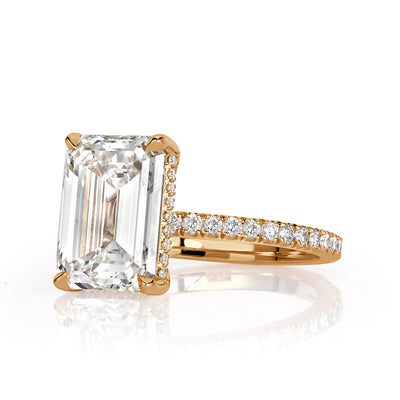 An emerald cut engagement ring is the epitome of beauty. This gorgeous 4.01ct center diamond is GIA certified at J-VS1. The center stone faces up perfectly eye clean and incredibly white. This beauty is graded as excellent in both polish and symmetry giving this diamond a stunning brilliance. Measuring at 10.86x7.72mm, this diamond's proportions are elegant and alluring. The pave set round brilliant diamonds that accent the champagne yellow gold setting complements this diamond perfectly and the hidden halo adds a hint of sparkle. This stylish and dazzling ring is sure to be a dream come true.