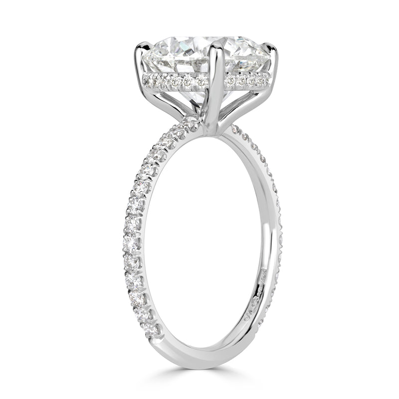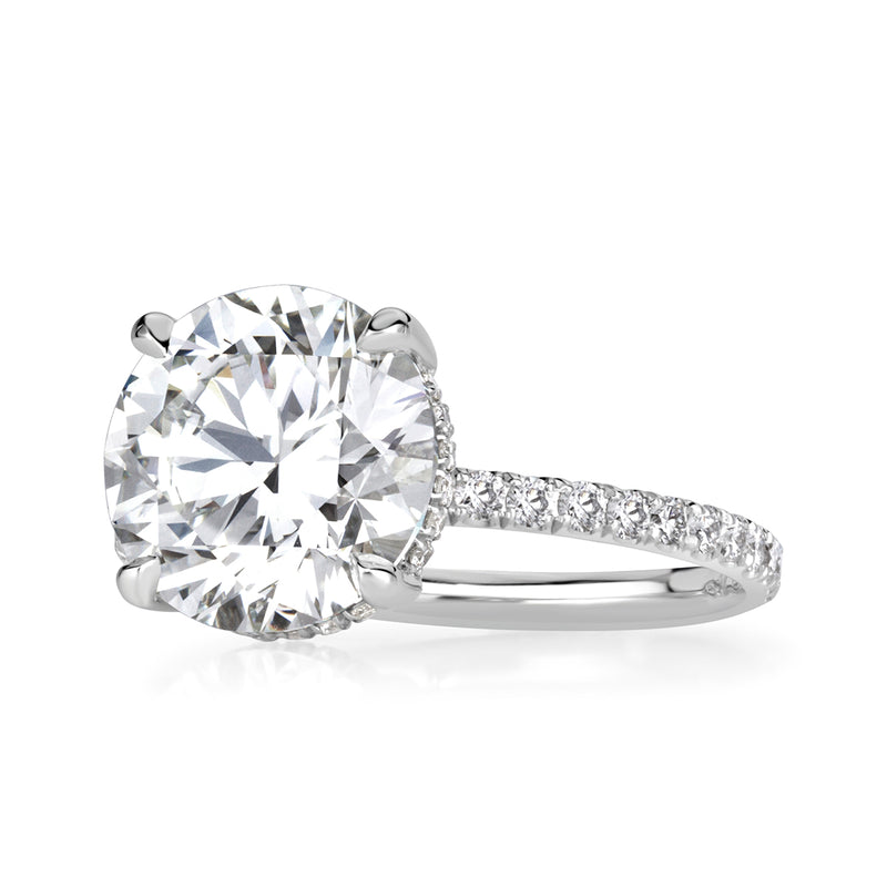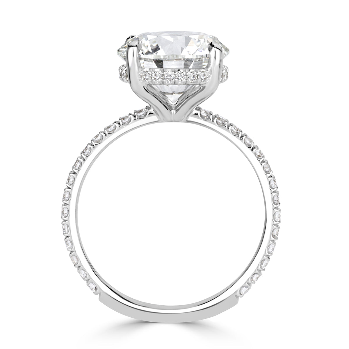 The perfect cut and tremendous sparkle on this 4.21ct round brilliant cut diamond engagement ring is nothing short of astonishing. The centerpiece showcases a stunning round GIA certified at G-VS2. It faces up a crisp white and perfectly eye clean! This beauty is also graded excellent for cut, polish and symmetry. The custom designed platinum micropavé setting features our signature hidden halo detail that peeks out from just underneath the center basket with extra sparkle. It is accented by a shimmering row of round brilliant cut diamonds on the shank that extends 3/4 of the way down. She will not hesitate to say 'Yes' to this timeless round brilliant cut diamond engagement ring.