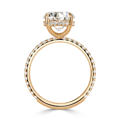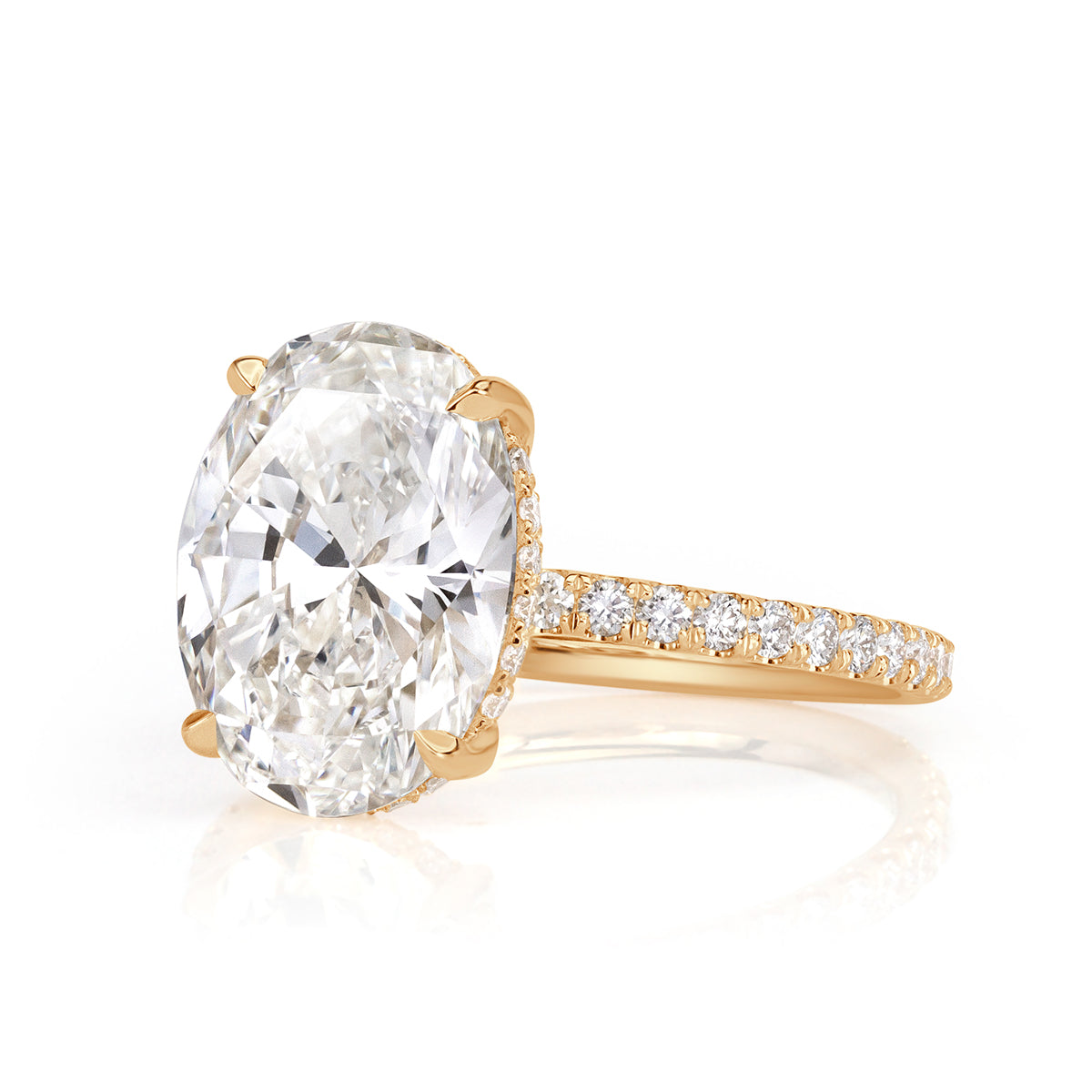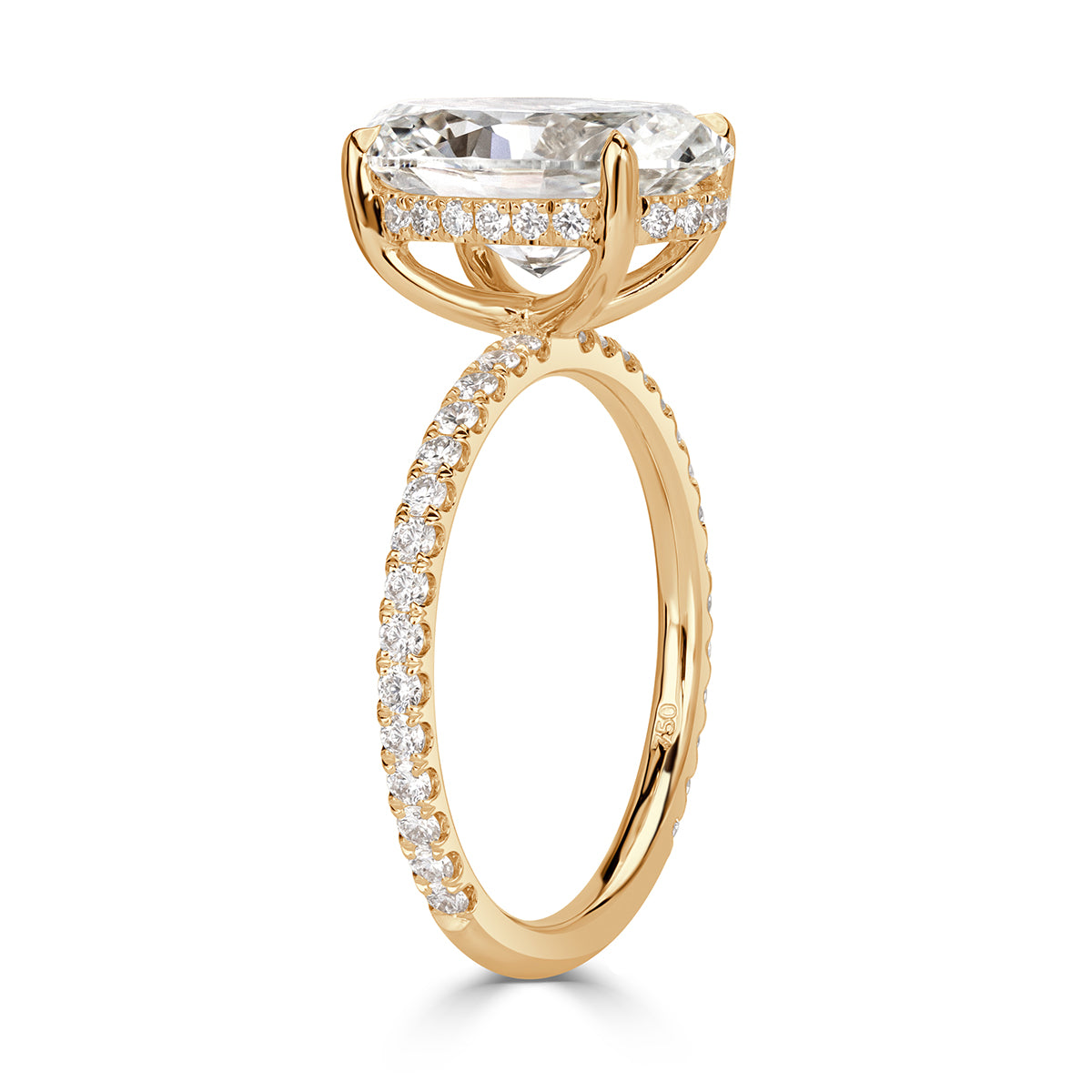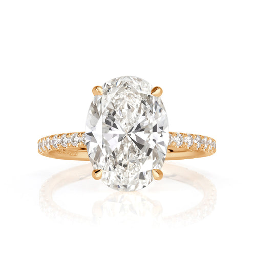 Sparkle has never been better illustrated than it has by this fiery oval cut diamond engagement ring. The perfectly proportioned 4.00ct oval cut diamond is GIA certified at I-SI1. This stunning diamond faces up beautifully clear and its small white inclusions give it the appearance of a VS quality diamond. Its excellent grading in both polish and symmetry add to this diamond’s dazzling display.  Measuring at 12.45 x 8.90mm, this beauty displays immense finger coverage! Its hidden halo setting along with the delicate round brilliant diamonds that are pavé set on the shank accent this diamond flawlessly. Expect compliments wherever you go while wearing this show stopping diamond engagement ring.
