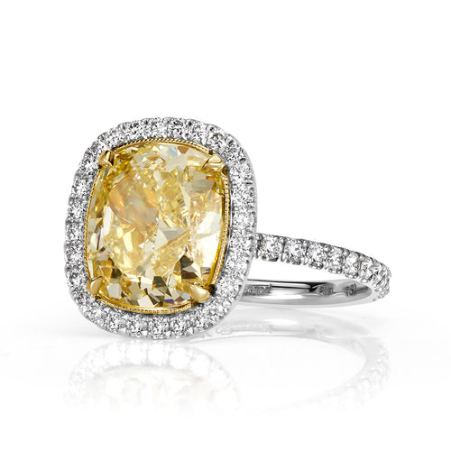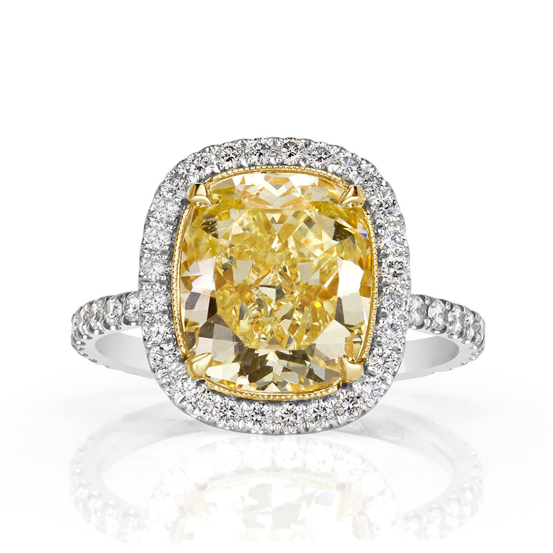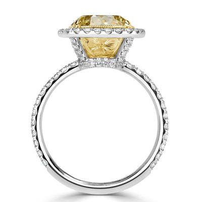 This stunner has an incredible value with it's amazing cut, color and clarity. In the center of this platinum engagement ring is a mesmerizing 4.07ct cushion cut diamond that is GIA certified at Fancy Yellow-VVS2. The diamond faces up a summery yellow and is nearly flawless in clarity! This beauty measures at 10.35 x 8.91 mm and showcases vast finger coverage especially set in it's stunning halo design. Dazzling round brilliant cut diamonds are handset into the basket connectors and going down the ring's shank for an overall sparkly look. The underbasket is hand-engraved with a delicate floral design and is set in 18k yellow gold. Capture her heart for forever with this one-of-a-kind cushion cut diamond engagement ring!