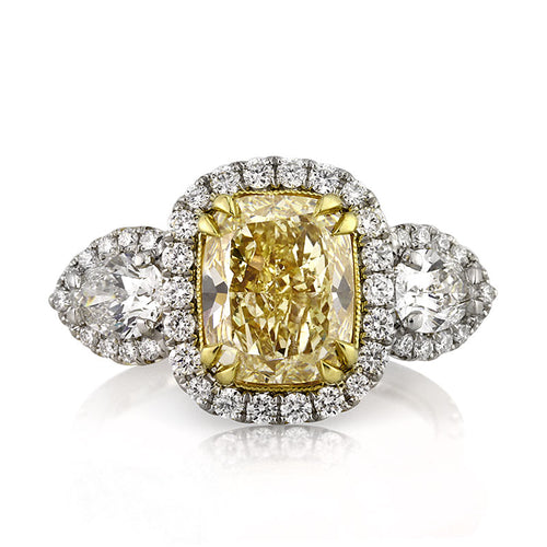 This remarkable work of art will mesmerize you with its exceptional size, quality and design! The spectacularly brilliant 3.00ct cushion cut center diamond is EGL certified, one of the leaders in diamond grading, at Fancy Light Yellow SI1. It has a very rich and vibrant canary yellow color and it is perfectly eye clean. The cut is outstanding as well! It is accented by a halo of round diamonds and flanked by two large pear shaped diamonds, which are set with a halo of round diamonds set around them. The shank is set with a row of round diamonds in a micro pave setting. The center and side baskets are elegantly accented by handmade filigree designs in 18k yellow gold. The connectors are also studded with round diamonds for an added touch of brilliance. It is absolutely mesmerizing from every angle!