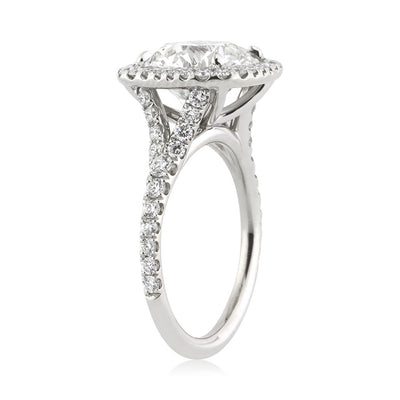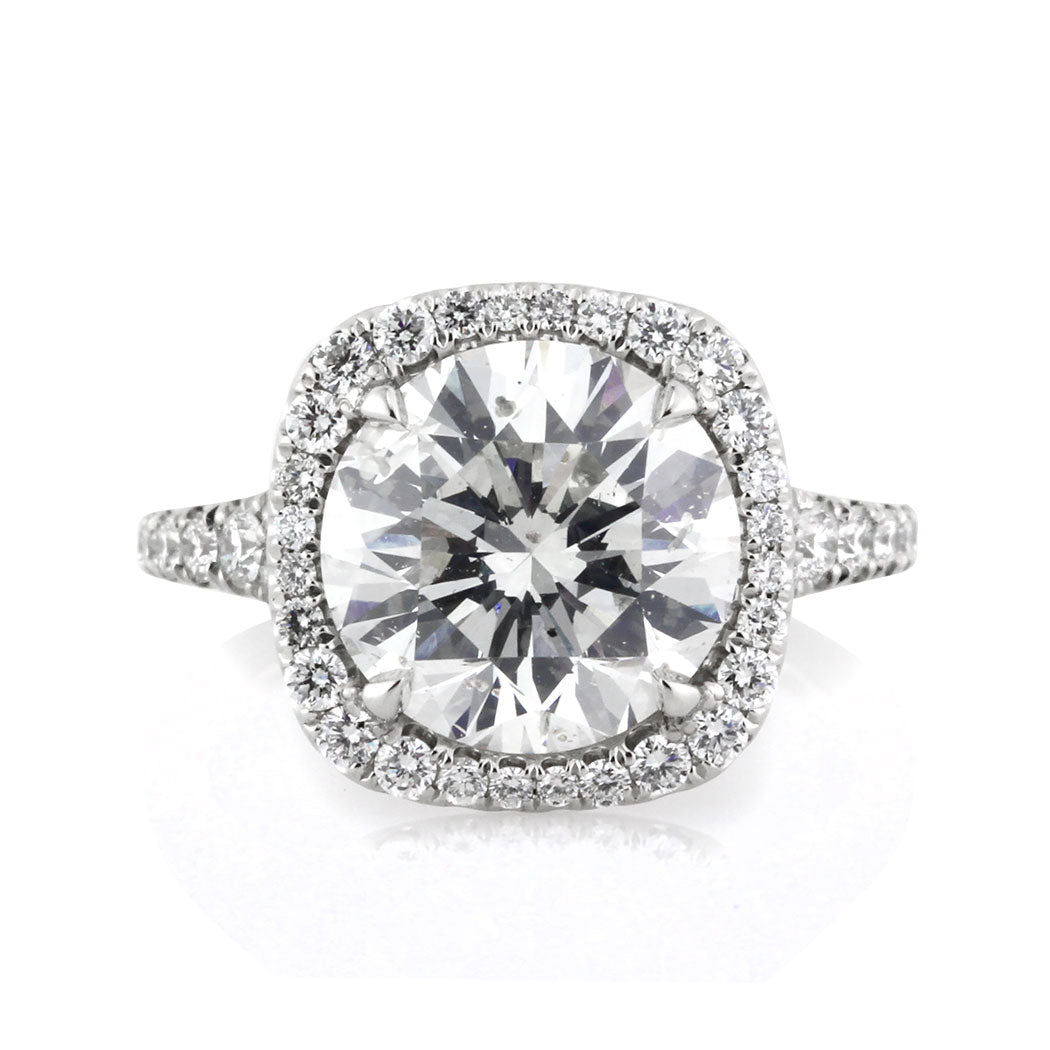 Forever timeless, this elegant round diamond and cushion halo engagement ring a classic. This magnificent 4.01ct round brilliant cut diamond is AGS certified at H-SI2. It is white and immensely brilliant. This diamond has a laser drill hole that gives it an eye clean look.The four carat center stone is surrounded by round diamonds in a cushion shaped halo and round diamonds set down the split shank. This high polish platinum and round diamond engagement ring is masterfully crafted and exquisitely designed for generations of admiration.